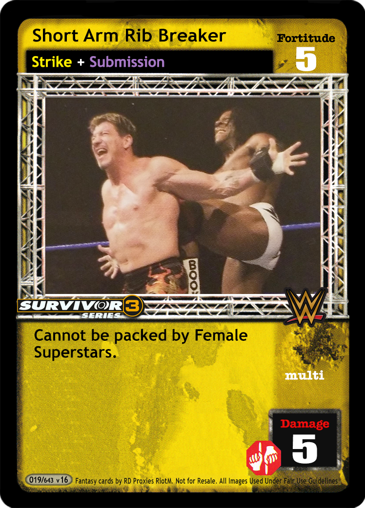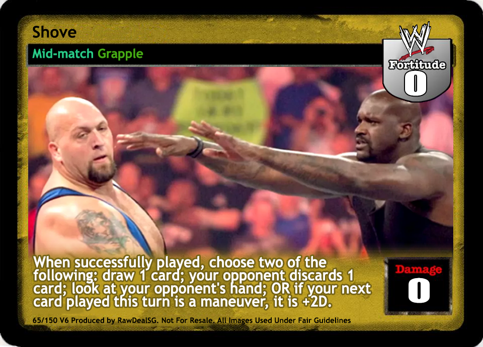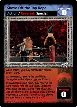 As an action, you may discard this card to draw 1 card. As a reversal, reverse the card titled Superplex and end your opponent's turn. If played from your hand, may reverse the card titled From the Top Rope. Opponent must take the top 3 cards from his Arsenal and put them into his Ringside pile. End your opponent's turn and if the first card played on your turn is a maneuver it is +3D.