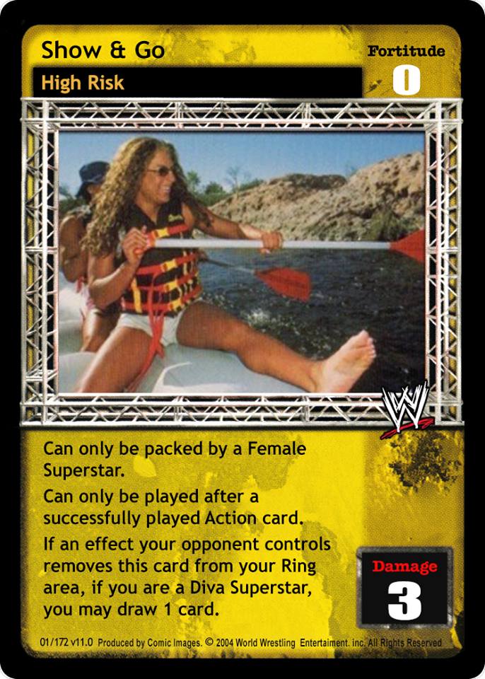 Can only be packed by a Female Superstar. Can only be played after a successfully played Action card. If an effect your opponent controls removes this card from your Ring area, if you are a Diva Superstar, you may draw 1 card.