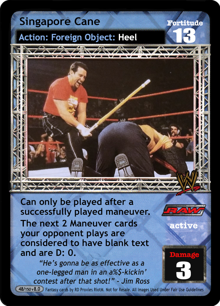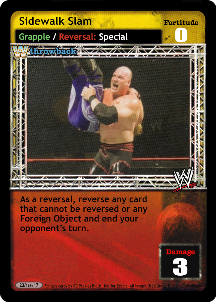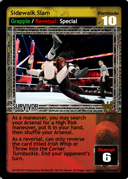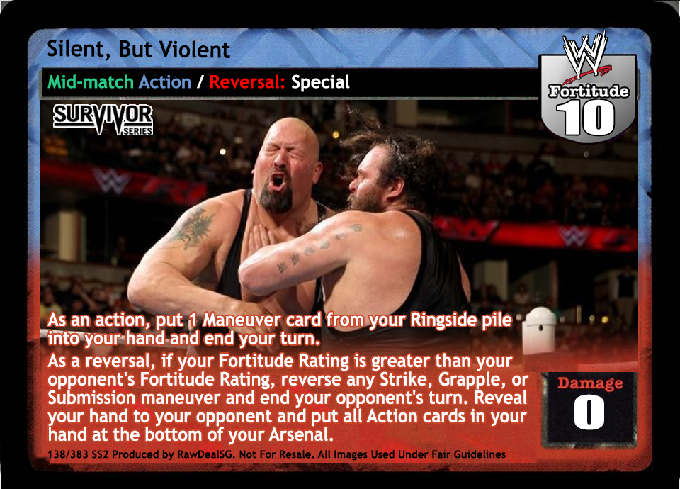 As an action, put 1 Maneuver card from your Ringside pile into your hand and end your turn. As a reversal, if your Fortitude Rating is greater than your opponent's Fortitude Rating, reverse any Strike, Grapple, or Submission maneuver and end your opponent's turn. Reveal your hand to your opponent and put all Action cards in your hand at the bottom of your Arsenal.