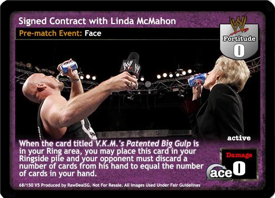 When the card titled V.K.M.'s Patented Big Gulp is in your Ring area, you may place this card in your Ringside pile and your opponent must discard a number of cards from his hand to equal the number of cards in your hand.