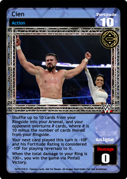 Shuffle up to 10 cards from your Ringside into your Arsenal, and your opponent overturns # cards, where # is 10- the number of cards moved from your Ringside. Your next card played this turn is -10F and his Fortitude Rating is considered -10F for playing reversals to it. When the total damage in your Ring is 100+, you win the game via Pinfall Victory.