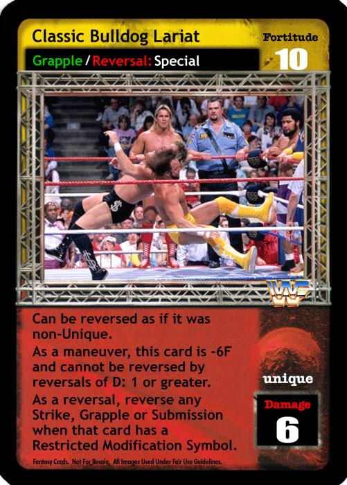 As a maneuver, this card is -6F and cannot be reversed by reversals of D: 1 or greater. As a reversal, reverse any Strike, Grapple or Submission when that card has a Restricted Modification Symbol.