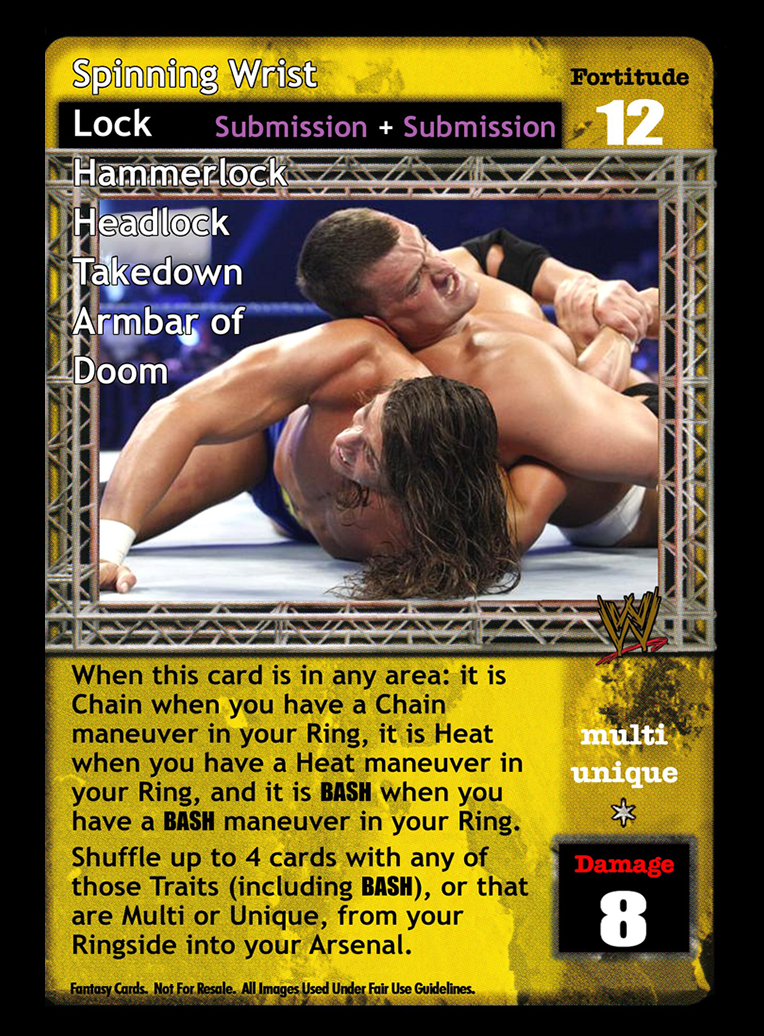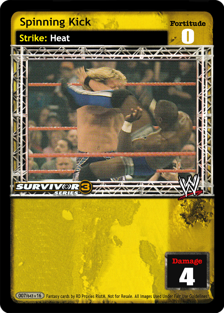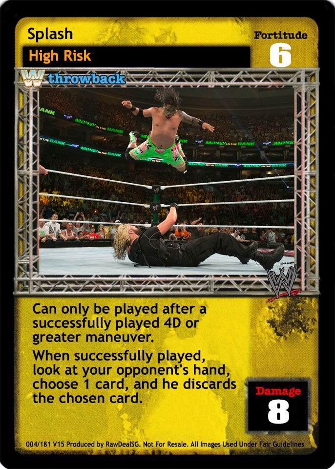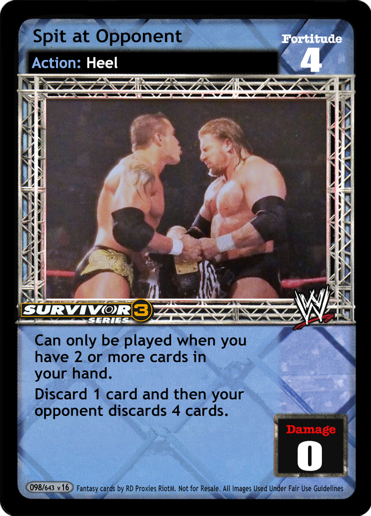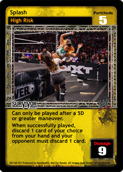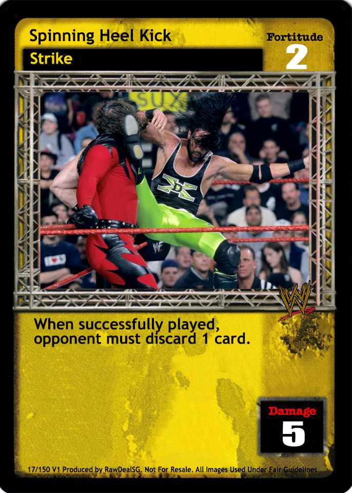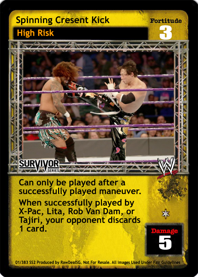 Can only be played after a successfully played maneuver. When successfully played by X-Pac, Lita, Rob Van Dam, or Tajiri, your opponent discards 1 card.