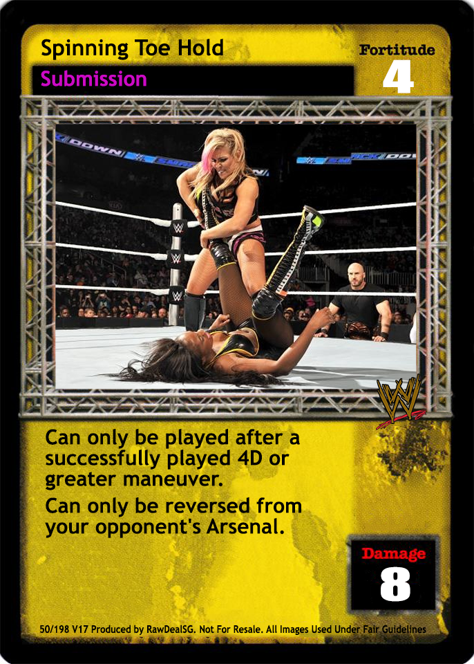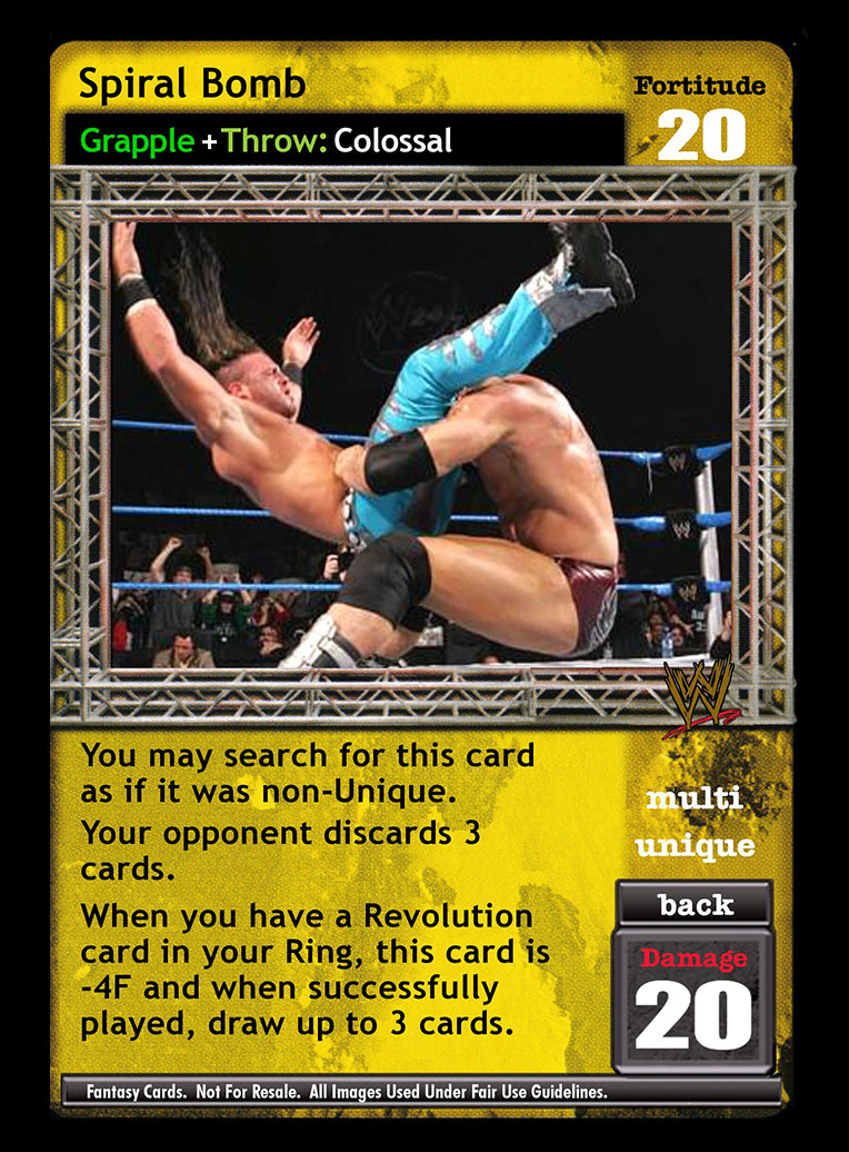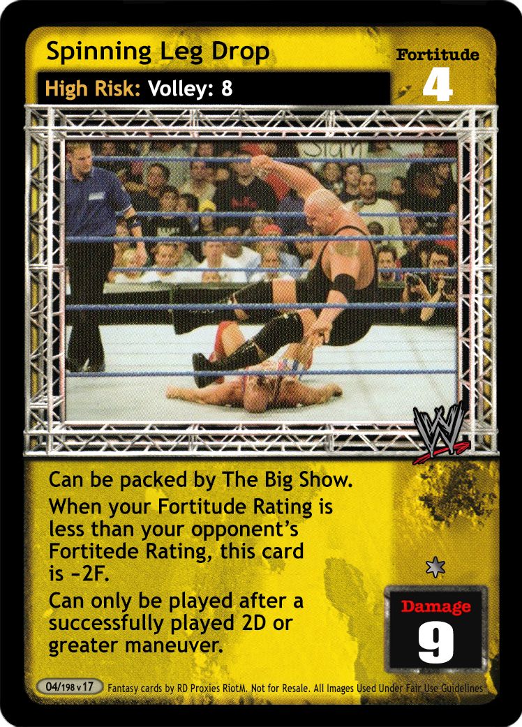 Can be packed by The Big Show. When your Fortitude Rating is less than your opponent's Fortitude Rating, this card is -2F. Can only be played after a successfully played 2D or greater maneuver.