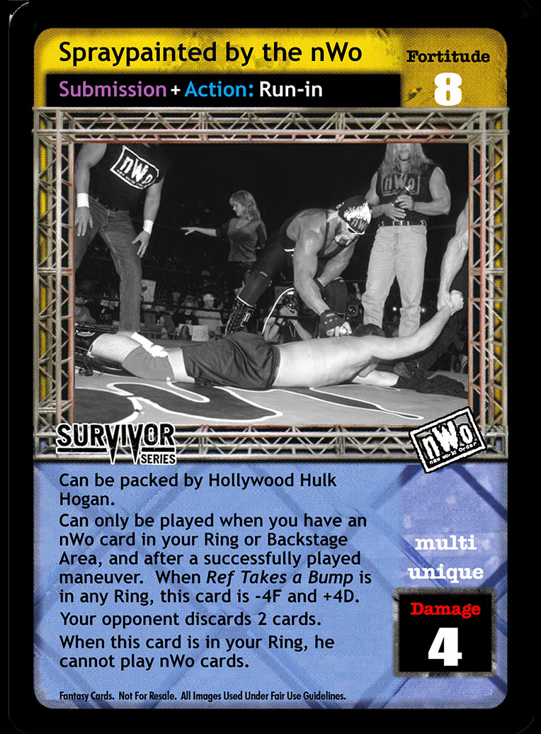 Can only be played when there is an nWo card in your Ring or Backstage Area and after a successfully played maneuver. When Ref Takes a Bump is in any Ring, this card is -4F and +4D. Your opponent discards 2 cards. When this card is in your Ring, he cannot play nWo cards.
