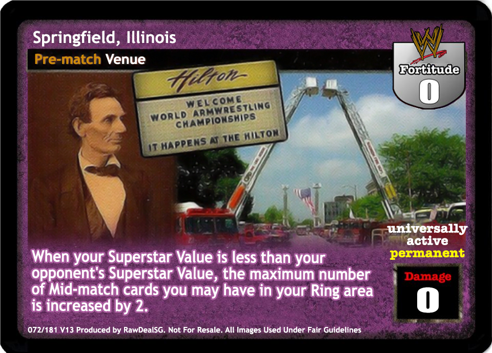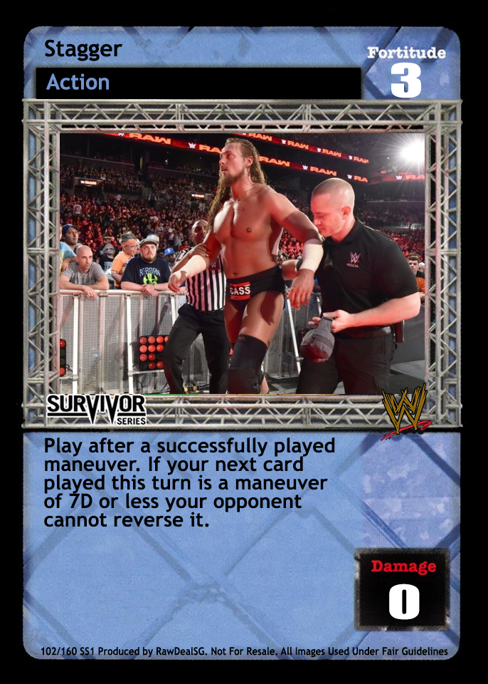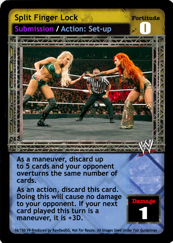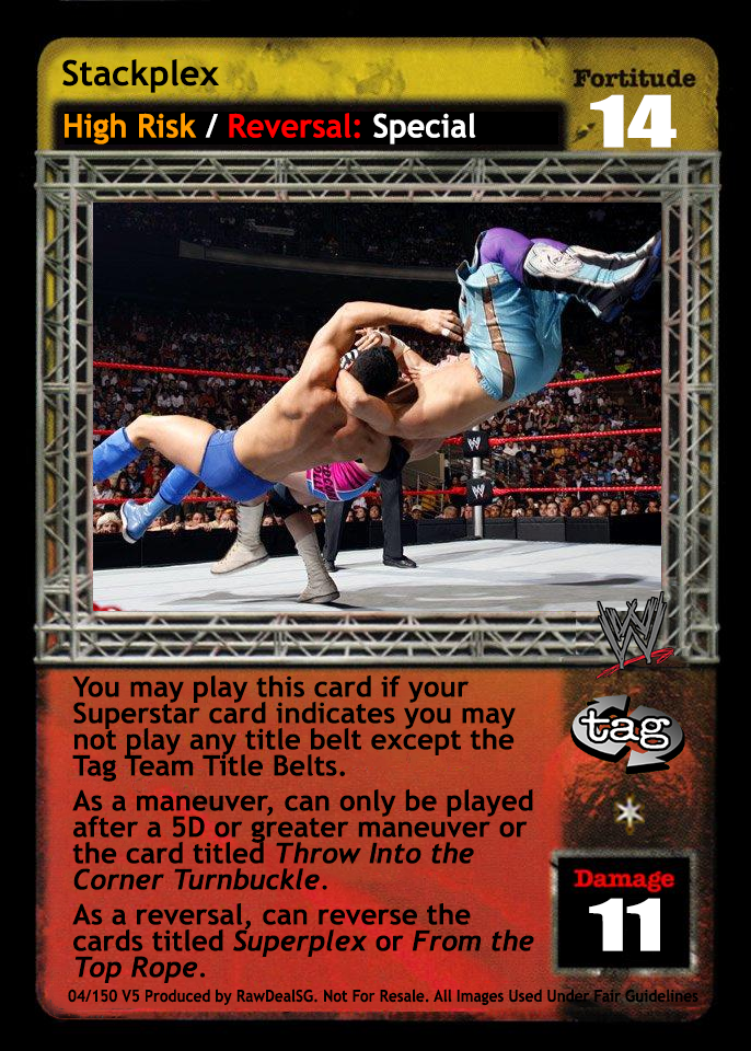 You may play this card if your Superstar card indicates you may not play any title belt except the Tag Team Title Belts. As a maneuver, can only be played after a 5D or greater maneuver or the card titled Throw Into the Corner Turnbuckle. As a reversal, can reverse the cards titled Superplex or From the Top Rope. When successfully played, opponent must choose 2 cards from his hand and place them on top of his Arsenal. This card is -7F if played by the Dudley Boyz or Edge & Christian.