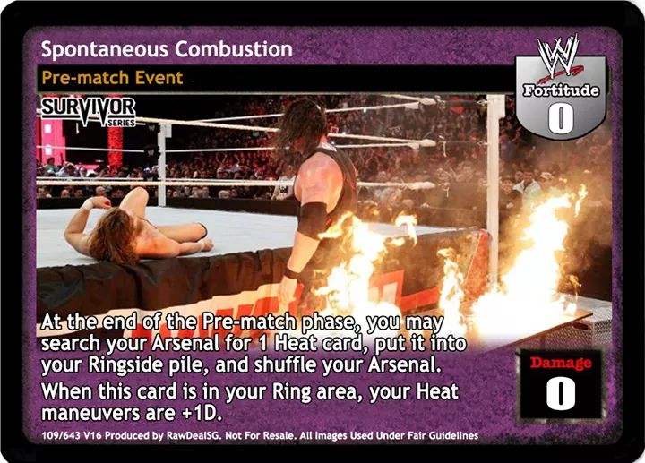 t the end of the Pre-match phase, you may search your Arsenal for 1 Heat card, reveal it to your opponent, put it into your Ringside pile, and shuffle your Arsenal. When this card is in your Ring area, your Heat maneuvers are +1D.