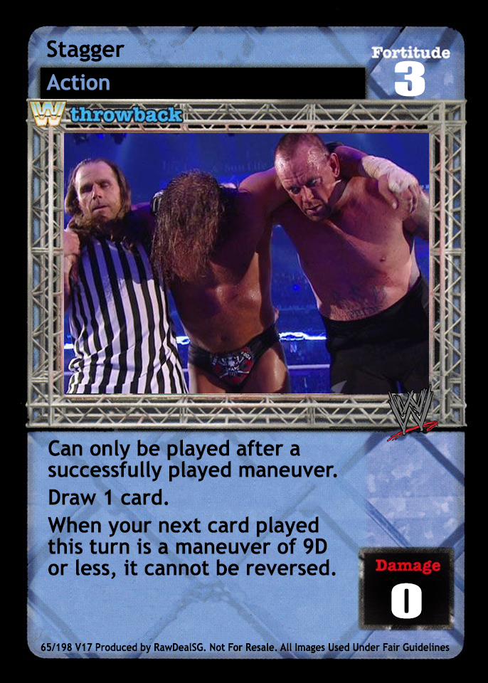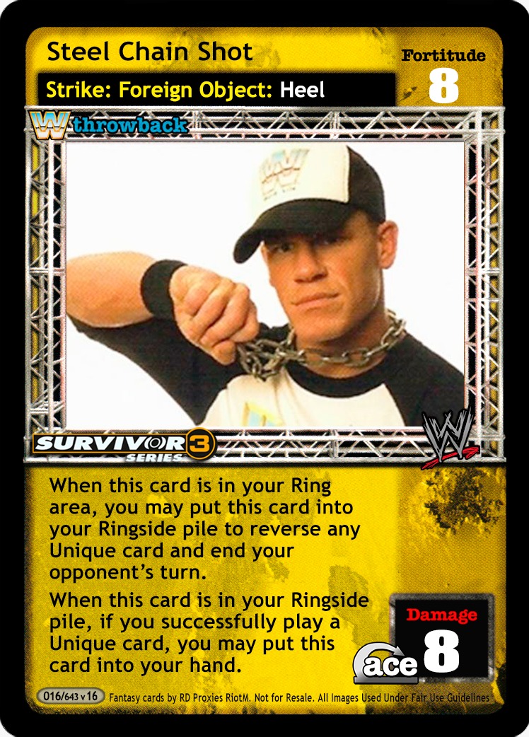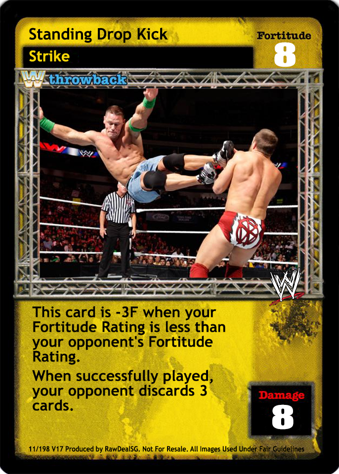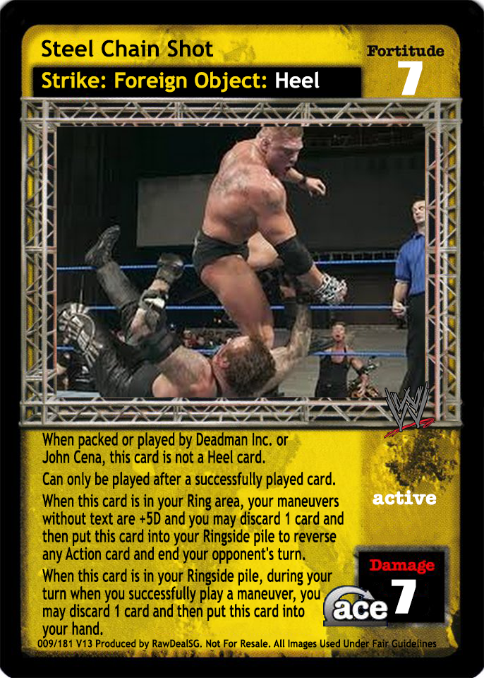 When packed or played by Deadman Inc. or John Cena, this card is not a Heel card. Can only be played after a successfully played card. When this card is in your Ring area, your maneuvers without text are +5D and you may discard 1 card and then put this card into your Ringside pile to reverse any Action card and end your opponent's turn. When this card is in your Ringside pile, during your turn when you successfully play a maneuver, you may discard 1 card and then put this card into your hand.