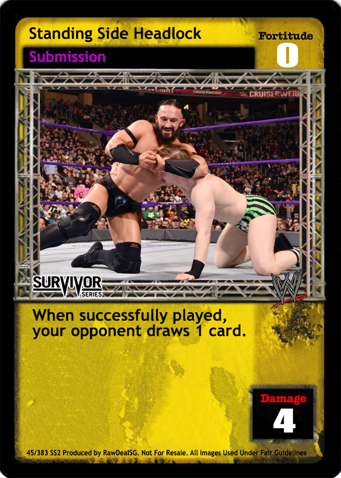When played after a card with 'arm drag' in the title, cannot be reversed from hand or Backlash. Put up to 1 card from your Ringside into your hand, and your opponent puts 1 random card from hand on the bottom of his Arsenal.