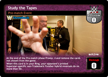 At the end of the Pre-match phase Promo: 4 and remove the cards not chosen from the game. When this card is in your Ring, your opponent’s printed Superstar-specific non-Trademark Finisher hybrid reversals do no more than 5D.