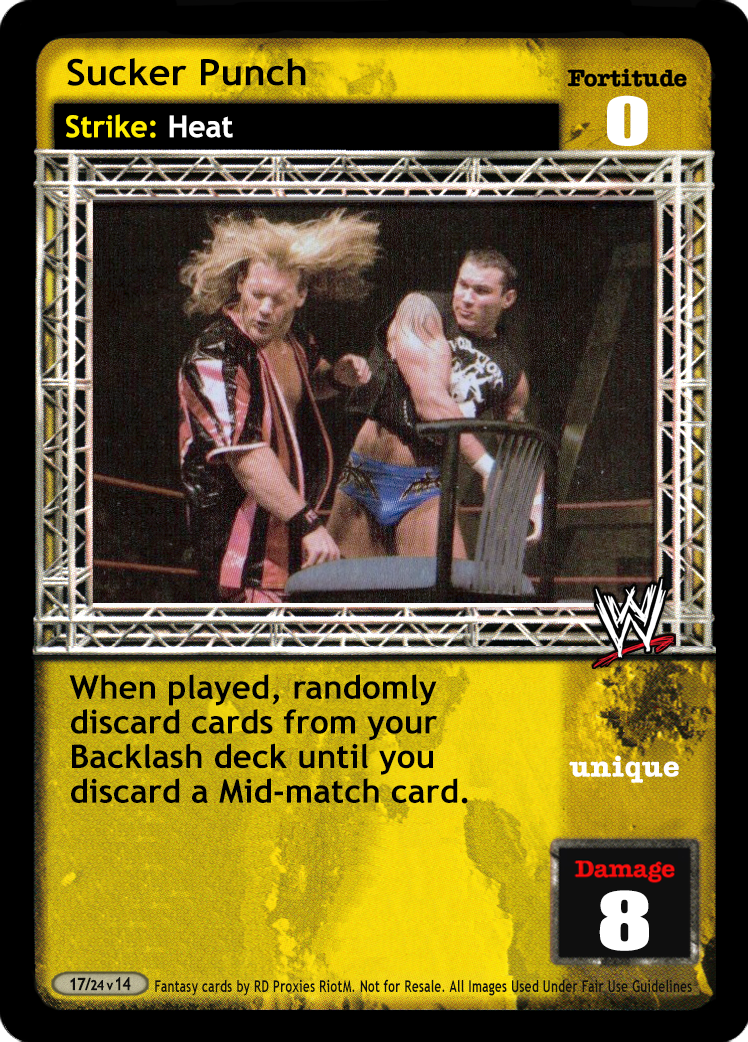 When played, randomly discard cards from your Backlash deck until you discard a Mid-match card.