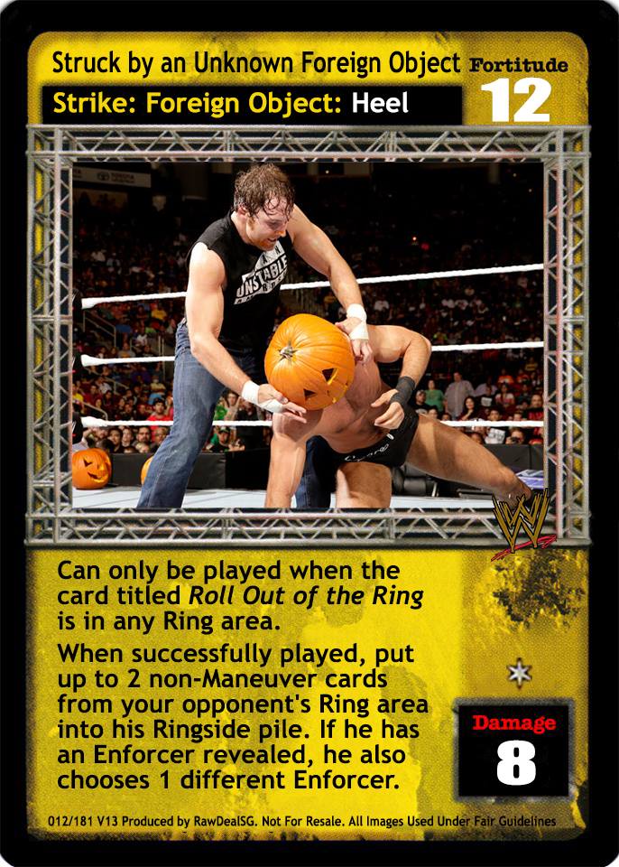 Can only be played when the card titled Roll Out of the Ring is in any Ring area. When successfully played, put up to 2 non-Maneuver cards from your opponent's Ring area into his Ringside pile. If he has an Enforcer revealed, he also chooses 1 different Enforcer.