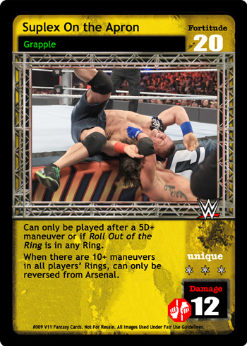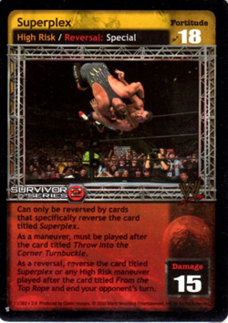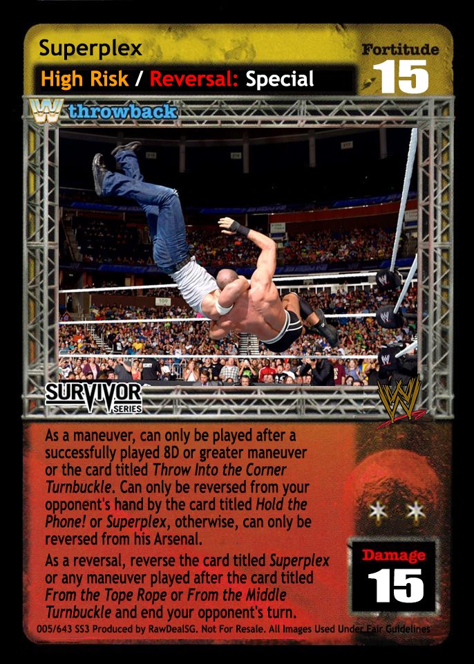 As a maneuver, can only be played after a successfully played 8D or greater maneuver or the card titled Throw Into the Corner Turnbuckle. Can only be reversed from your opponent's hand by the card titled Hold the Phone! or Superplex, otherwise, can only be reversed from his Arsenal. As a reversal, reverse the card titled Superplex or any maneuver played after the card titled From the Tope Rope or From the Middle Turnbuckle and end your opponent's turn.