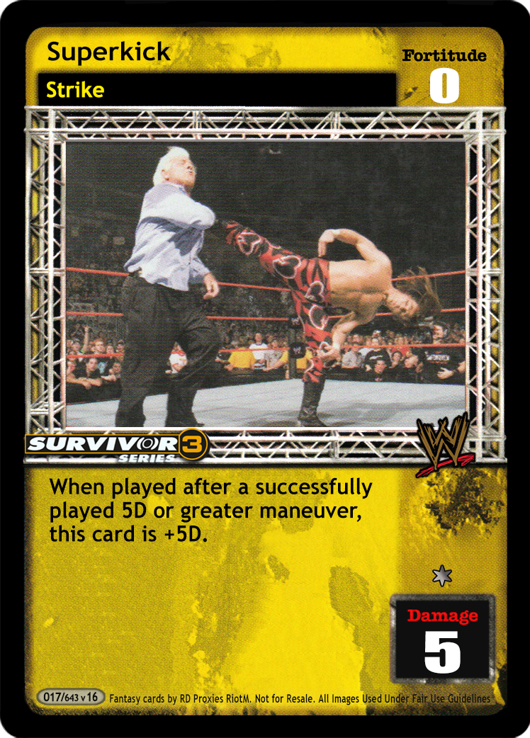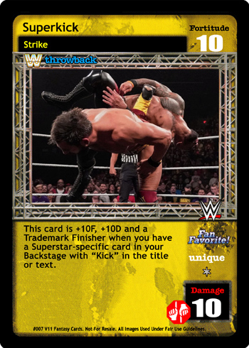 This card is +10F, +10D and a Trademark Finisher when you have a Superstar-specific card in your Backstage with 'Kick' in the title or text.
