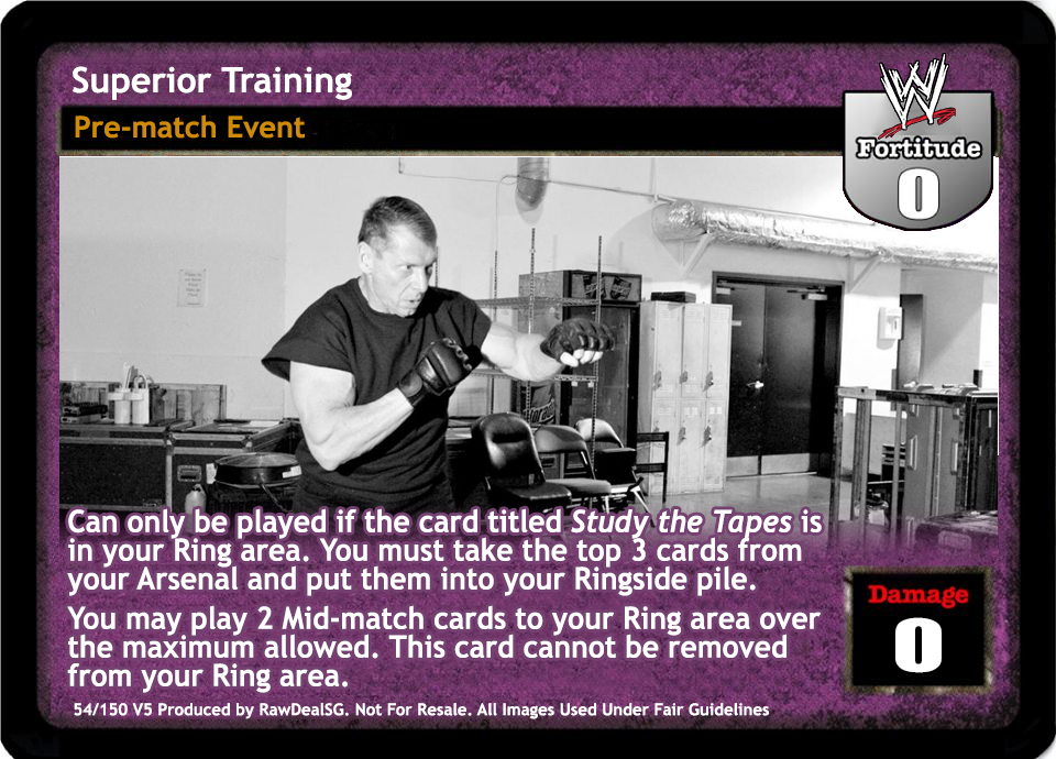 Can only be played if the card titled Study the Tapes is in your Ring area. You must take the top 3 cards from your Arsenal and put them into your Ringside pile. You may play 2 Mid-match cards to your Ring area over the maximum allowed. This card cannot be removed from your Ring area.