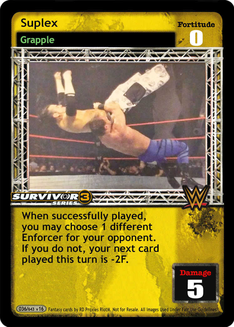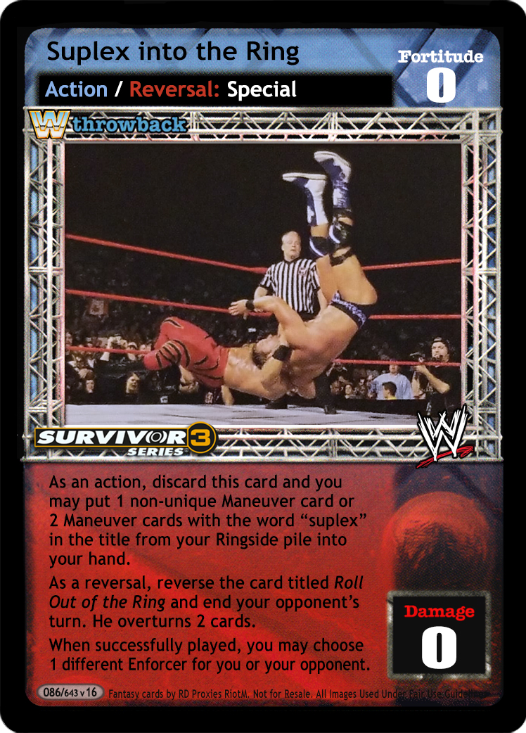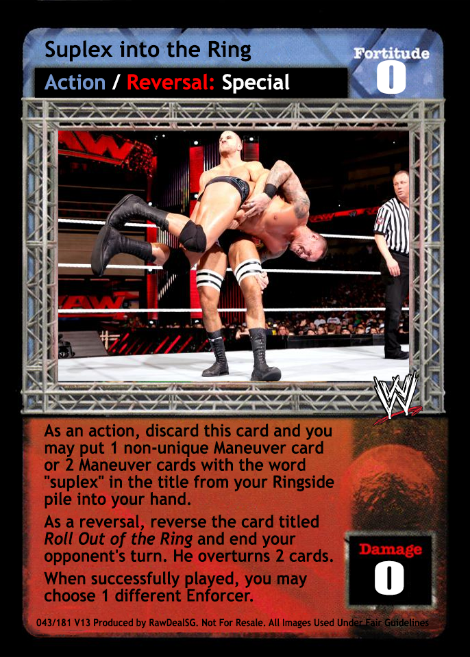 As an action, discard this card and you may put 1 non-unique Maneuver card or 2 Maneuver cards with the word "suplex" in the title from your Ringside pile into your hand. As a reversal, reverse the card titled Roll Out of the Ring and end your opponent's turn. He overturns 2 cards. When successfully played, you may choose 1 different Enforcer.