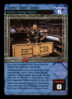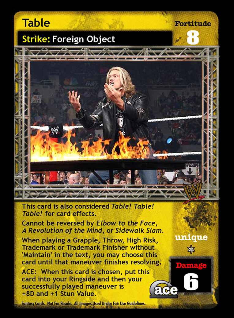 This card is also considered to be titled Table! Table! Table! for card effects. Cannot be reversed by Elbow to the Face, Revolution of the Mind, or Sidewalk Slam. When playing an Extreme of printed 5D or greater, Grapple, Throw, High Risk, Trademark or Trademark Finisher without 'Maintain' in the text, you may choose this card until that maneuver finishes resolving. ACE: When this card is chosen, put this card into your Ringside and then your successfully played maneuver is +8D and +1 Stun Value.