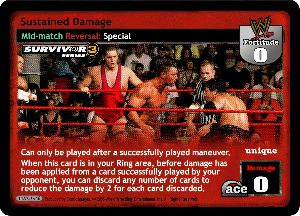 Can only be played when you have a card in your Ring area with a Survivor Series logo and a card in your Ring area without a Survivor Series logo. When this card is in your Ring area, during your turn you may put this card into your Ringside pile and then remove any number of cards in your Ringside pile from the game and then shuffle up to the same number of cards with a Survivor Series logo from your Ringside pile into your Arsenal.