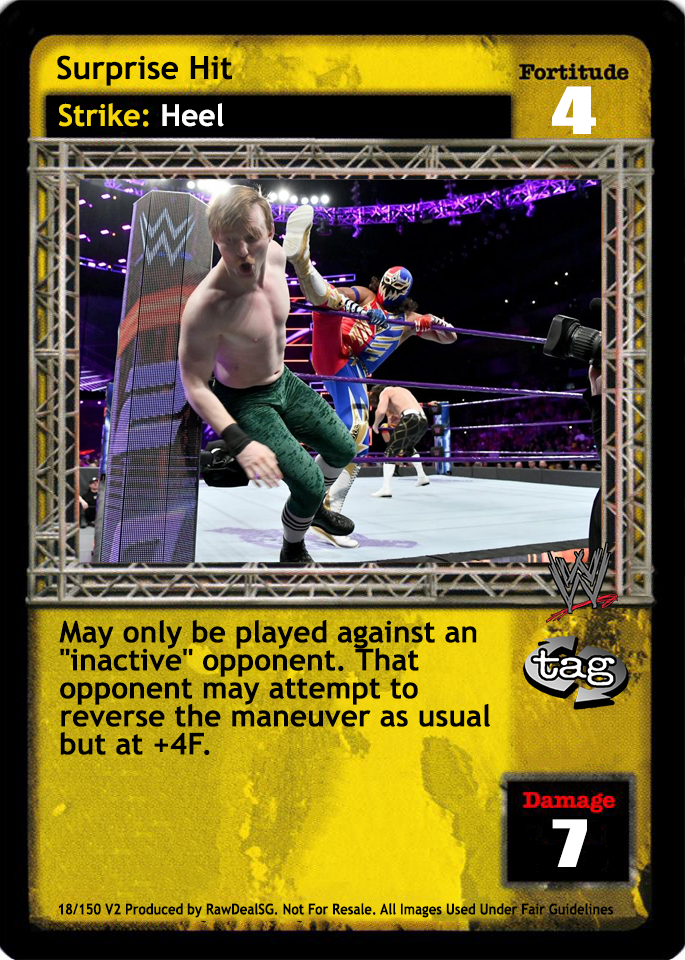 Can only be played after a successfully played 4D or greater maneuver. When this card is in your Ring area, you may put this card in your Ringside pile and your next Grapple maneuver played this turn is +8D and +1 Stun Value, and your opponent's Reversals to it are +4D. When successfully played by the Dudley Boyz, you may put 1 Grapple maneuver from your Ringside pile into your hand.