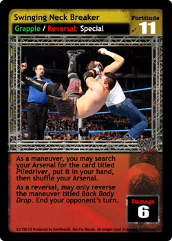 As a maneuver, you may search your Arsenal for the card titled Piledriver, put it in your hand, then shuffle your Arsenal. As a reversal, may only reverse the maneuver titled Back Body Drop. End your opponent's turn.