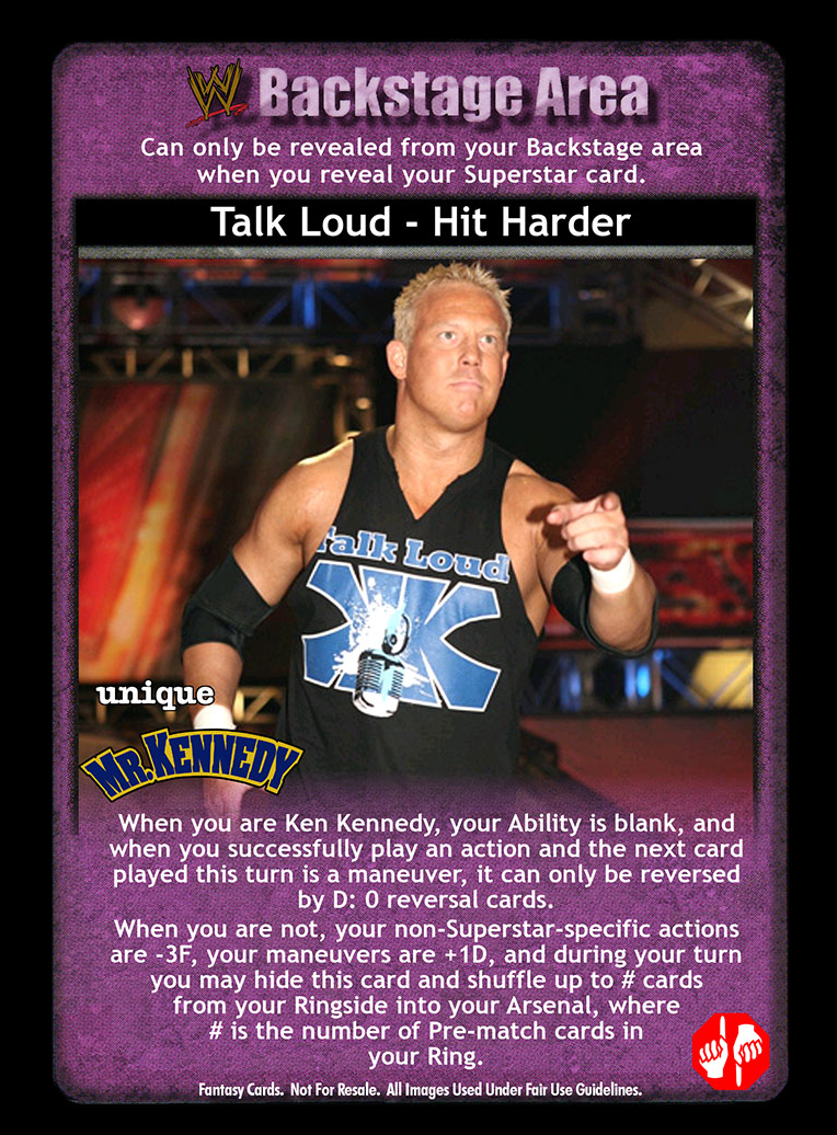 When you are Ken Kennedy, your Ability is blank, and when you successfully play an action card and the next card played that turn is a maneuver, it can only be reversed by D: 0 reversal cards. When you are not, your non-Superstar-specific actions are -3F, your maneuvers are +1D, and during your turn you may hide this card and shuffle up to # cards from your Ringside into your Arsenal, where # is the number of Pre-match cards in your Ring.