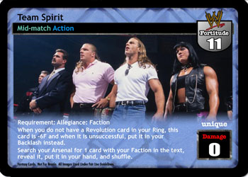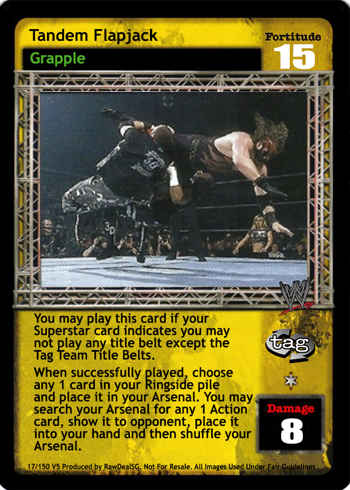 You may play this card if your Superstar card indicates you may not play any title belt except the Tag Team Title Belts. When successfully played, choose any 1 card in your Ringside pile and place it in your Arsenal. You may search your Arsenal for any 1 Action card, show it to opponent, place it into your hand and then shuffle your Arsenal.