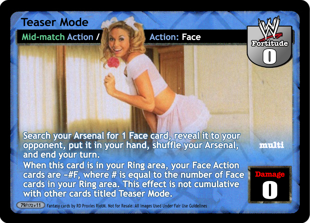 Search your Arsenal for 1 Face card, reveal it to your opponent, put it in your hand, shuffle your Arsenal, and end your turn. When this card is in your Ring area, your Face Action cards are -#F, where # is equal to the number of Face cards in your Ring area. This effect is not cumulative with other cards titled Teaser Mode.