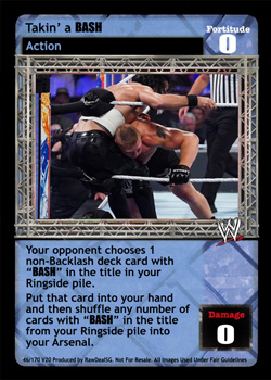 Your opponent chooses 1 non-Backlash deck card with "BASH" in the title in your Ringside pile. Put that card into your hand and then shuffle any number of cards with "BASH" in the title from your Ringside pile into your Arsenal.