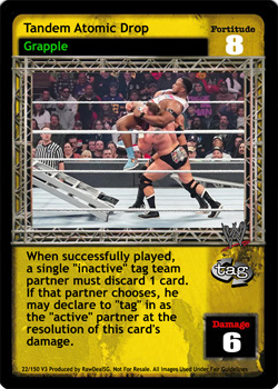 When successfully played, a single "inactive" tag team partner must discard 1 card. If that partner chooses, he may declare to "tag" in as the "active" partner at the resolution of this card's damage.