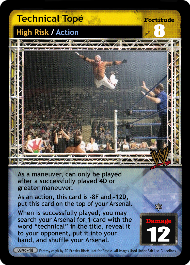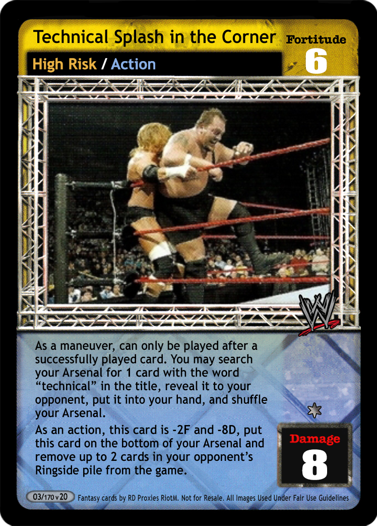 As a maneuver, can only be played after a successfully played card. You may search your Arsenal for 1 card with the word "technical" in the title, reveal it to your opponent, put it into your hand, and shuffle your Arsenal. As an action, this card is -2F and -8D, put this card on the bottom of your Arsenal and remove up to 2 cards in your opponent's Ringside pile from the game.
