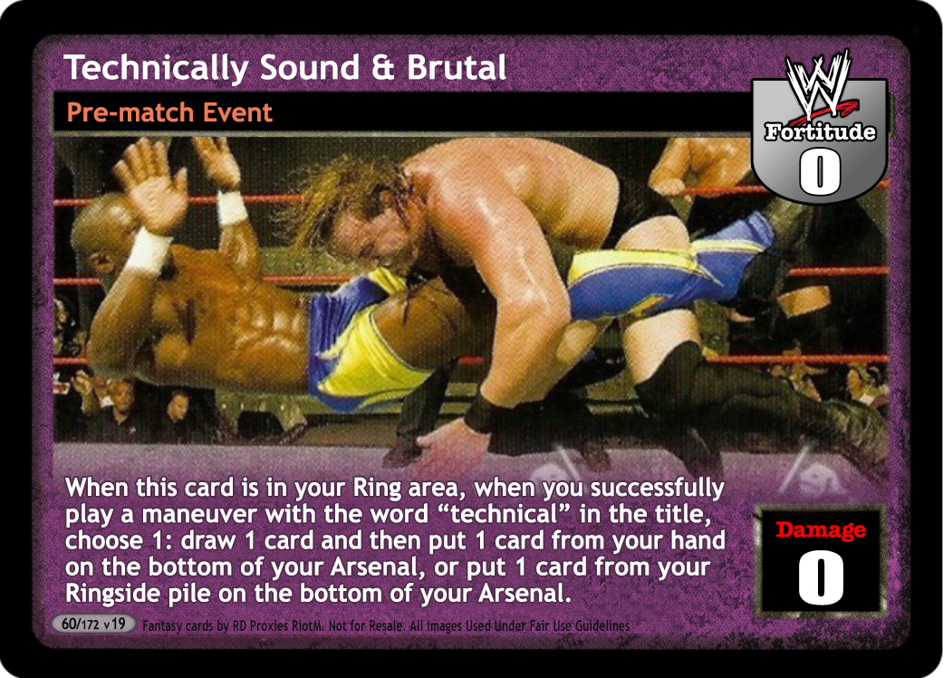 When this card is in your Ring area, when you successfully play a maneuver with the word "technical" in the title, choose 1: draw 1 card and then put 1 card from your hand on the bottom of your Arsenal, or put 1 card from your Ringside pile on the bottom of your Arsenal.