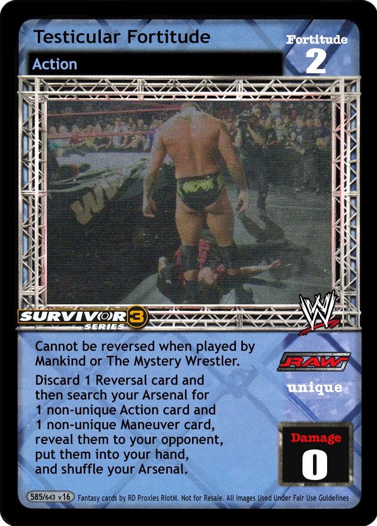 Cannot be reversed when played by Mankind or The Mystery Wrestler. Discard 1 Reversal card and then search your Arsenal for 1 non-unique Action card and 1 non-unique Maneuver card, reveal them to your opponent, put them into your hand, and shuffle your Arsenal.