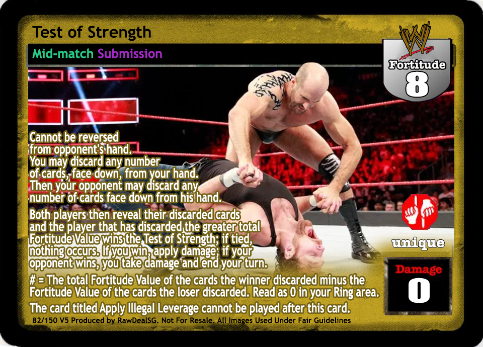 Cannot be reversed from opponent's hand. You may discard any number of cards, face down, from your hand. Then your opponent may discard any number of cards face down from his hand. Both players then reveal their discarded cards and the player that has discarded the greater total Fortitude Value wins the Test of Strength; if tied, nothing occurs. If you win, apply damage; if your opponent wins, you take damage and end your turn. # = The total Fortitude Value of the cards the winner discarded minus the Fortitude Value of the cards the loser discarded. Read as 0 in your Ring area. The card titled Apply Illegal Leverage cannot be played after this card.