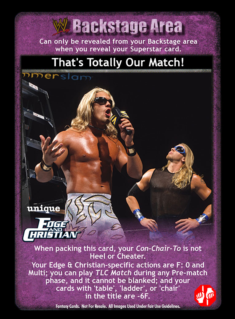 When packing this card, your Con-Chair-To is not Heel or Cheater. Your Edge and Christian-specific actions are F: 0 and Multi. You may play TLC Match during any Pre-match phase, it cannot be blanked; and your cards with 'table', 'ladder', or 'chair' in the title are -6F.