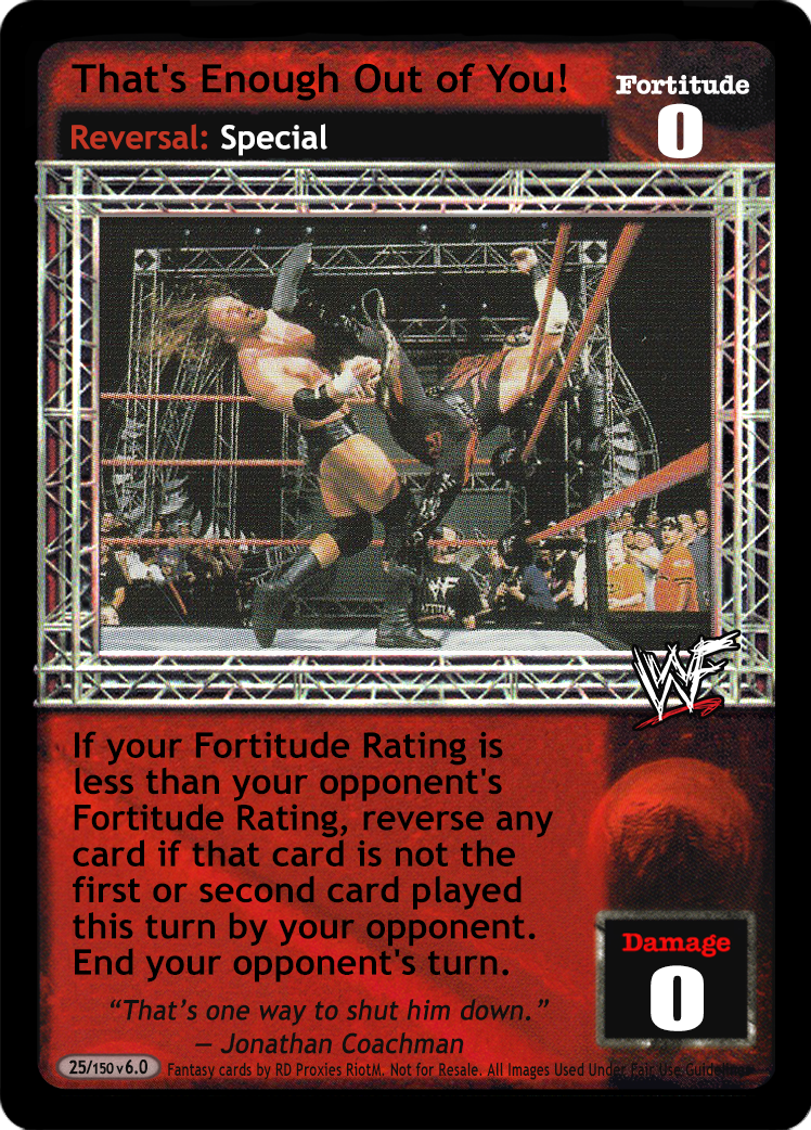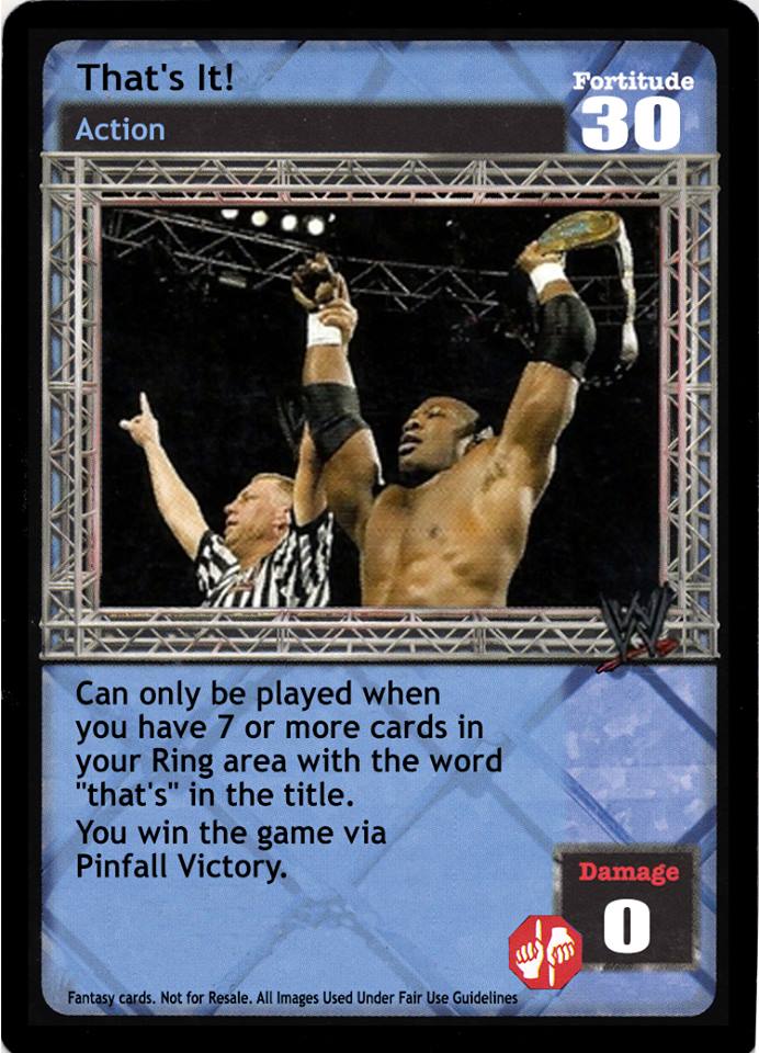 Can only be played when you have 7 or more cards in your Ring area with the word "that's" in the title. You win the game via Pinfall Victory.