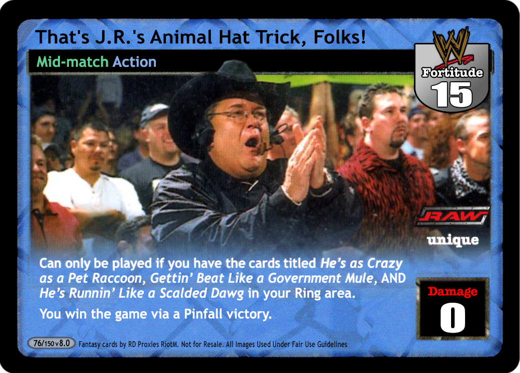 Can only be played if you have the cards titled He's as Crazy as a Pet Raccoon, Gettin' Beat Like a Government Mule, AND He's Runnin' Like a Scalded Dawg in your Ring area. You win the game via a Pinfall victory.