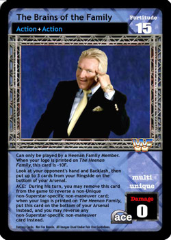 Can only be played by a Heenan Family Member. When your logo is printed on The Heenan Family, this card is -10F. Look at your opponent's hand and Backlash, then put up to 3 cards from your Ringside on the bottom of your Arsenal. ACE: During his turn, you may remove this card from the game to reverse a non-Unique non-Superstar-specific non-maneuver card; when your logo is printed on The Heenan Family, put this card on the bottom of your Arsenal instead, and you may reverse any non-Superstar-specific non-maneuver card instead.