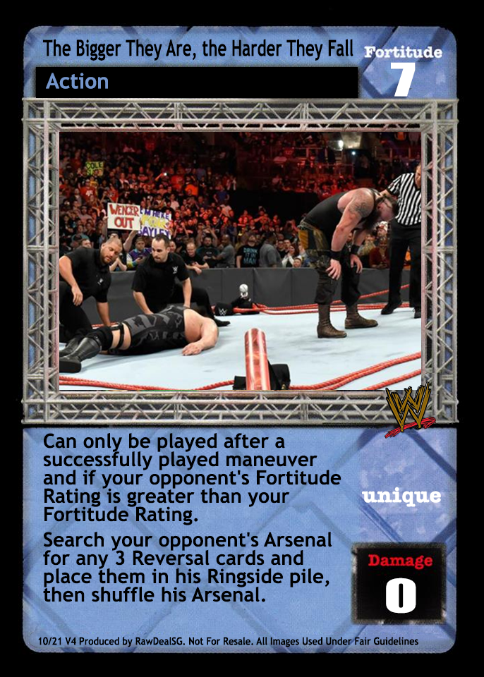 Can only be played after a successfully played maneuver and if your opponent's Fortitude Rating is greater than your Fortitude Rating. Search your opponent's Arsenal for any 3 Reversal cards and place them in his Ringside pile, then shuffle his Arsenal.