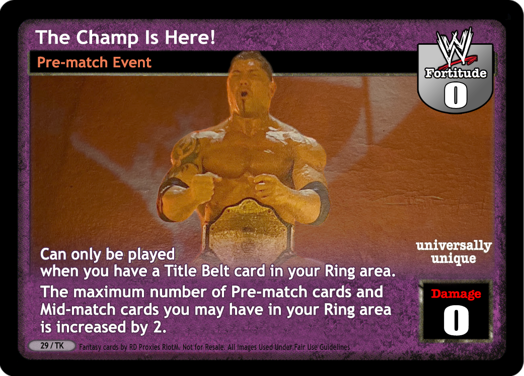 Can only be played when you have a Title Belt card in your Ring area. The maximum number of Pre-match cards and Mid-match cards you may have in your Ring area is increased by 2.