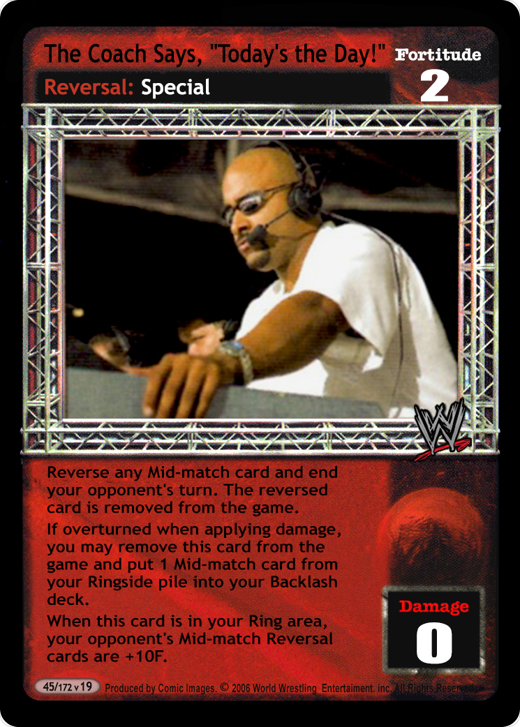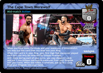 Cannot be blanked and does not take up a Pre-match slot in your Ring. When your maneuver without Stun Value is reversed, you may draw 1 card and your opponent overturns 2 cards. During his turn when this card is in your Ring, he may discard 2 random cards to put this card into your Ringside. Before your Draw Segment, when this card is in your Backlash or Ringside you may overturn 2 cards and put this card into your Ring.