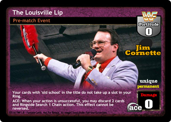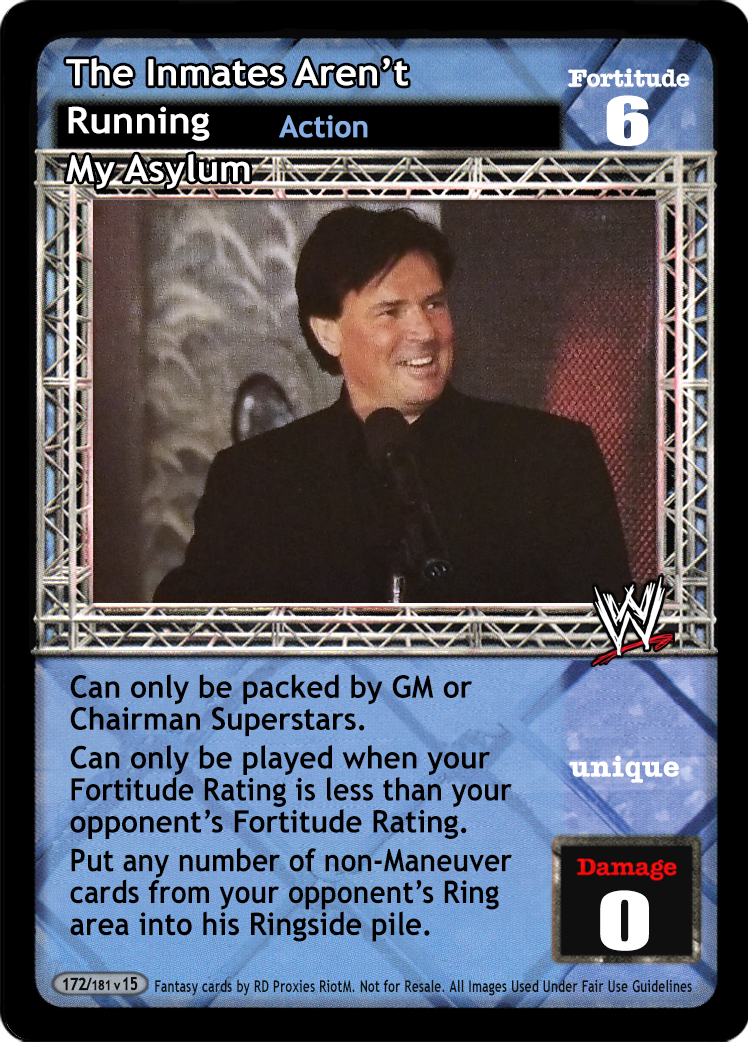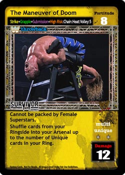 Can only be packed by a GM or Chairman Superstar. Can only be played when you have lower Fortitude. Put any number of non-maneuver cards from your opponent's Ring into his Ringside, and overturn 2 cards.