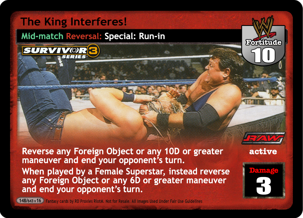 Reverse any Foreign Object card OR any 10D or greater maneuver and end your opponent's turn. If played by a Female Superstar, instead reverse any Foreign Object card OR any 6D or greater maneuver and end your opponent's turn.