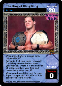 When played after a Unique card, this card is -8F. Put up to # of your cards removed from the game on the bottom of your Arsenal, where # is the number of Unique cards in your Ring and cannot be greater than 10. When you discard this card for your Superstar-specific card effects, it is considered to be 3 cards.