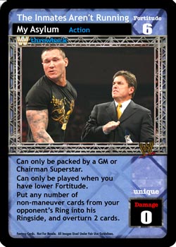Can only be packed by GM or Chairman Superstars. Can only be played when your Fortitude Rating is less than your opponent's Fortitude Rating. Put any number of non-Maneuver cards from your opponent's Ring area into his Ringside pile.