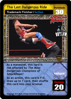 As a maneuver, this card is not affected by The Most Dangerous Champions of SmackDown!. As an action, this card is F:0, draw up to 1 card, then shuffle this card into your Arsenal.