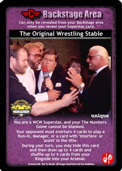 You are a WCW Superstar, and your The Numbers Game cannot be blanked. Your opponent must overturn 4 cards to play a Run-in, Manager, or a card with 'interfere' or 'assist' in the title. During your turn, you may hide this card and then draw up to 4 cards and shuffle up to 4 cards from your Ringside into your Arsenal.