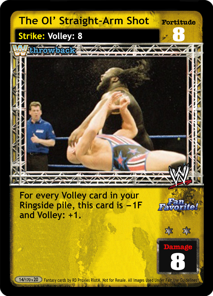 Your non-Multi Volley: # maneuvers read as Volley: #+3, and your opponent's non-Superstar-Specific reversals to them deal no damage. When your Fortitude Rating is less than 10, he cannot reverse from Ring or remove cards from his Ringside to reverse your non-Multi Volley maneuvers.