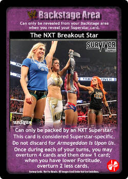 Can only be packed by an NXT Superstar. This card is considered Superstar-specific. Do not discard for Armageddon Is Upon Us. Once during each of your turns, you may overturn 4 cards and then draw 1 card; when you have lower Fortitude, overturn 2 less cards.