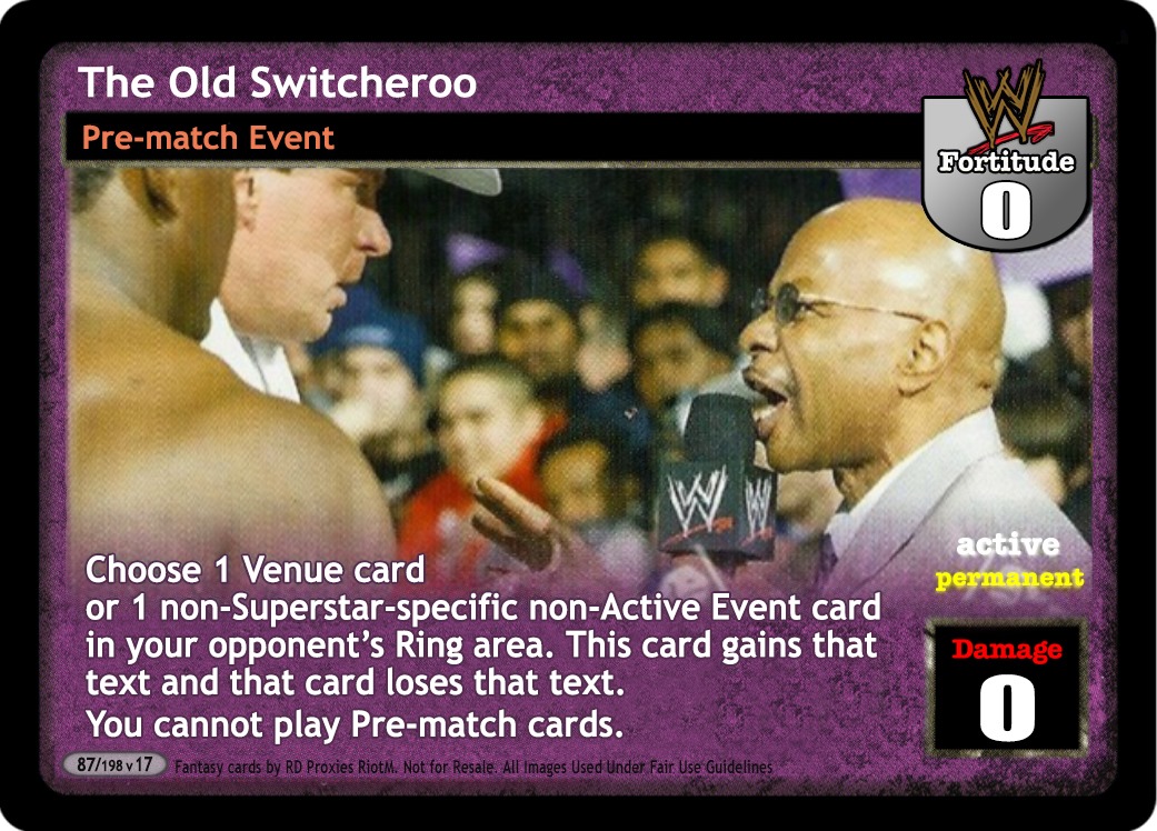 Choose 1 Venue card or 1 non-Superstar-specific non-Active Event card in your opponent's Ring area. This card gains that text and that card loses that text. You cannot play Pre-match cards.