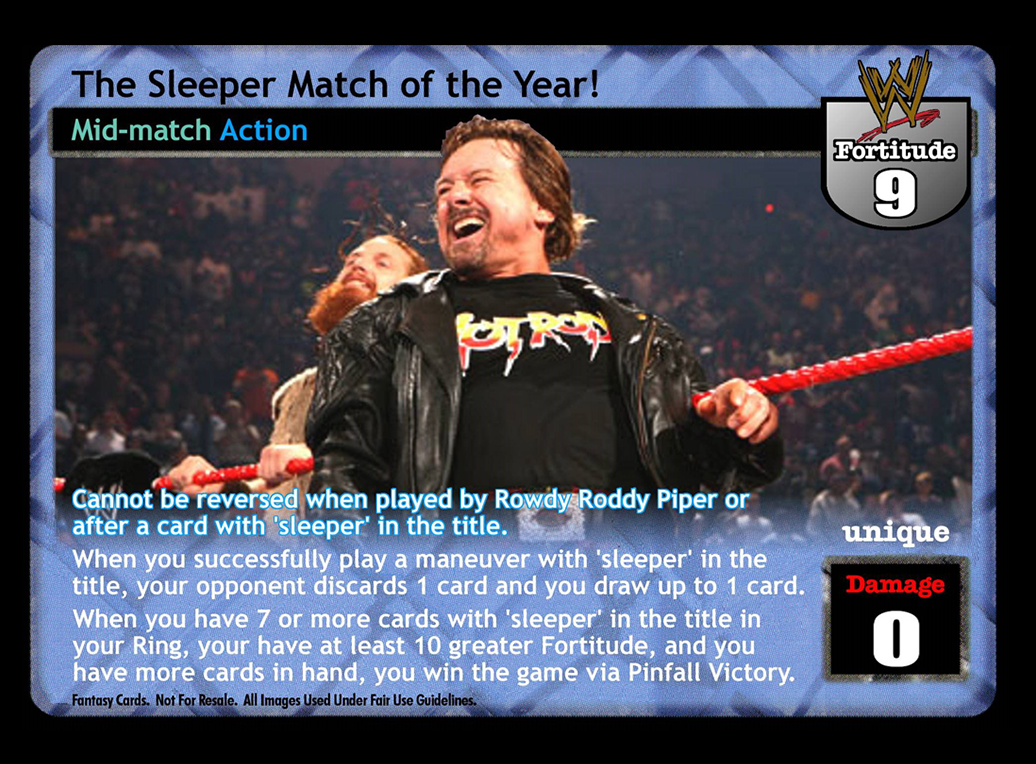 Cannot be reversed when played by Rowdy Roddy Piper or after a card with 'sleeper' in the title. When you successfully play a maneuver with 'sleeper' in the title, your opponent discards 1 card and you draw up to 1 card. When you have 7 or more cards with 'sleeper' in the title in your Ring, you have at least 10 greater Fortitude, and you have more cards in hand, you win the game via Pinfall Victory.